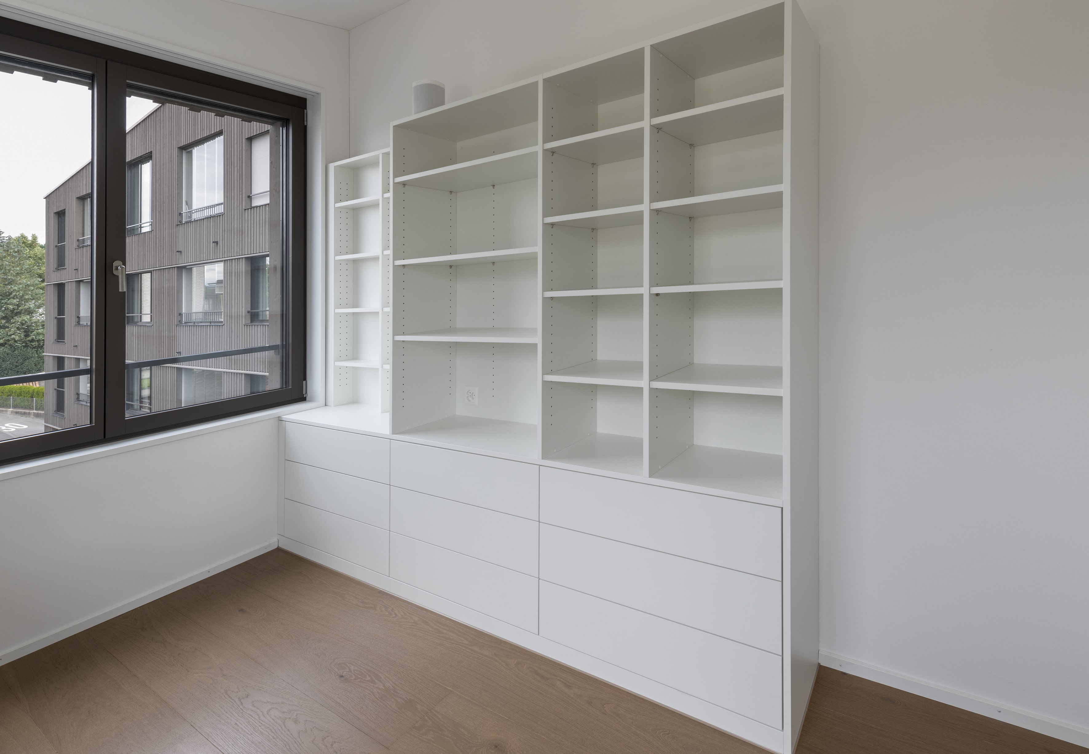 Jeder Raum in Ihrem Büro sollte funktional sein. Mit Regalen nach Mass lassen sich auch schwierige Ecken und Nischen perfekt ausnutzen. Möchten Sie zum Beispiel einen schmalen Raum hinter Ihrem Schreibtisch oder unter einem Fenster optimal gestalten? Ein massgefertigtes Regal kann diese Fläche genau ausfüllen, sodass Sie keinen wertvollen Platz verlieren und gleichzeitig alles ordentlich verstauen können.